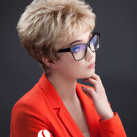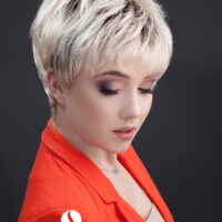 Peruka wykonana z włosów syntetycznych. Bardzo trwała i wygodna. Posiada monofilament na przedziałku, który doskonale imituje skórę głowy i pozwala na zmianę uczesania. Rozmyta przednia linia włosów (front lace) tworzy naturalne przejście między linią czoła a peruką.Dzięki temu czoło może być całkowicie odsłonięte. Dostępna jest w wielu odcieniach blondu, brązu, rudości, również w wersji z pasemkami, odrostem.
